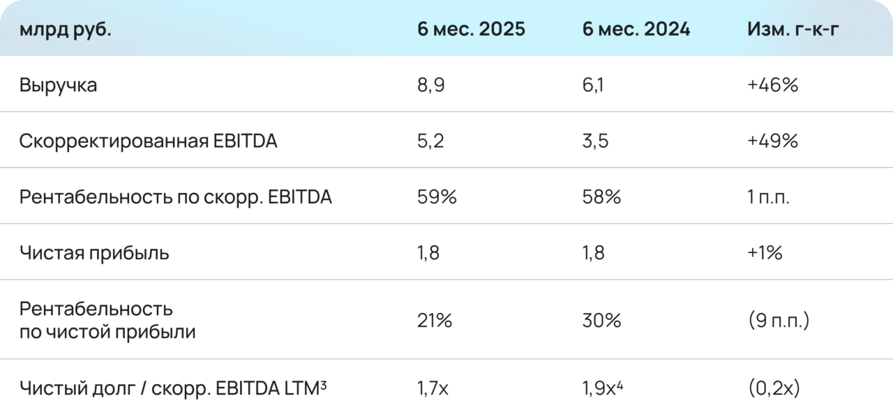 - Долговая нагрузка сохраняется на комфортном уровне. Отношение чистого долга к скорр. EBITDA составило 1,7х на 30 июня 2025 года.