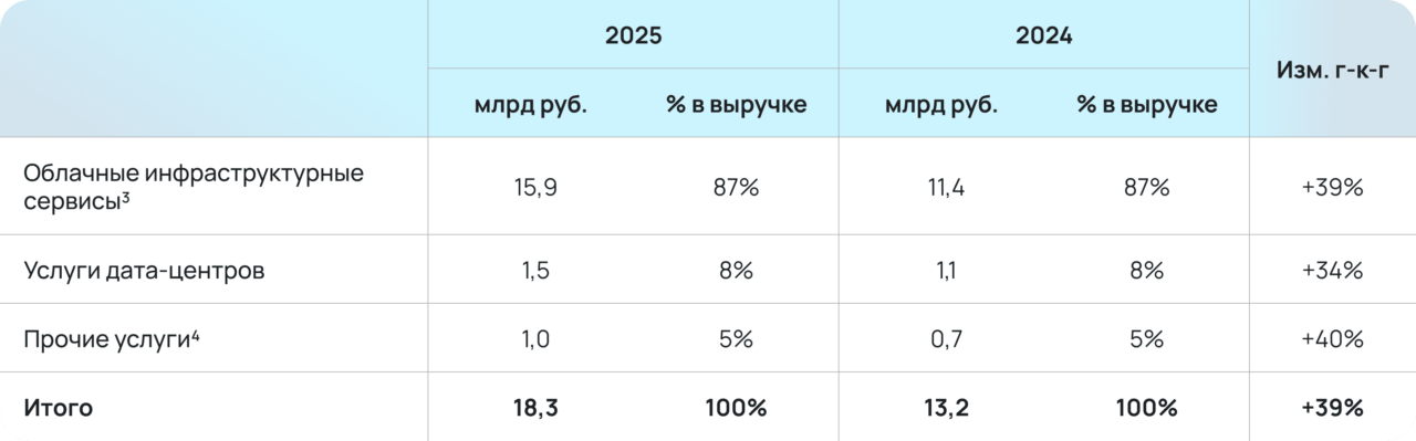 Выручка от продажи облачных инфраструктурных сервисов — основного направления бизнеса, на которое приходится 87% доходов компании, составила 15,9 млрд рублей, что на 39% выше, чем в 2024 году. Общая выручка компании по итогам 2025 года выросла до 18,3 млрд рублей. Прирост выручки составил 39% год к году и включает эффект от приобретения компании Servers.ru, консолидированной в периметр Группы в конце 2024 года.