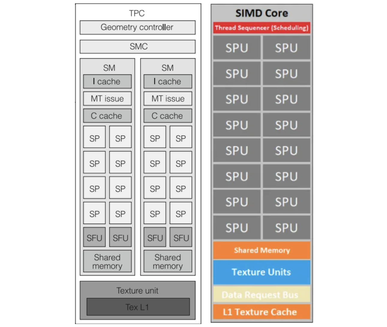 Если дальше зуммировать и смотреть на более мелкие блоки, то первое, что может прийти в голову — сопоставление TPC (Texture/Processor Cluster) и SIMD Core (Single Instruction Multiple Data):
