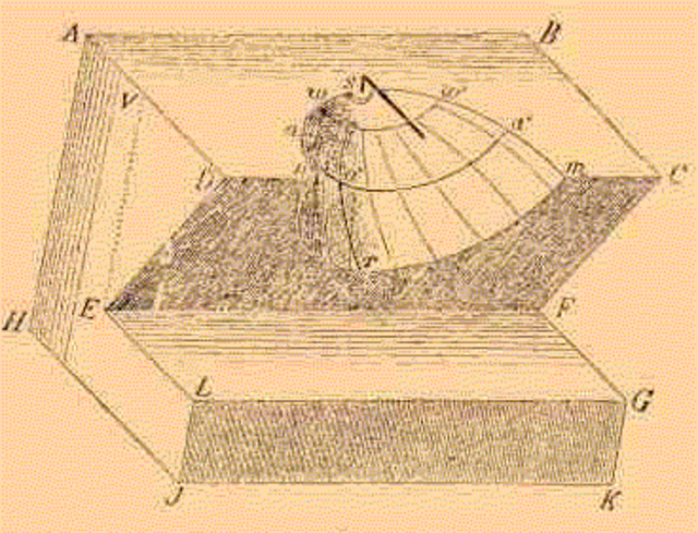 Эратосфен понял, что для начала нужно вычислить градус отклонения солнечных лучей от зенита. Сделал он это с помощью скафиса — устройства в виде полусферы с иглой в центре, которое позволяло вычислять угол падения солнечных лучей. Он определил, что в Александрии солнце отклоняется от зенита на 7° 12′, или 1/50 окружности.