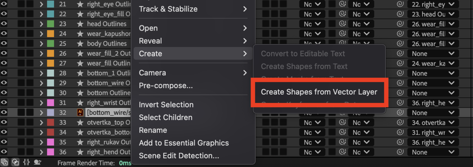 3. Переведите все импортированные слои в Shapes. Если этого не сделать, при экспорте JSON вы потеряете визуальную часть анимации из-за привязки к файлу Adobe Illustrator.