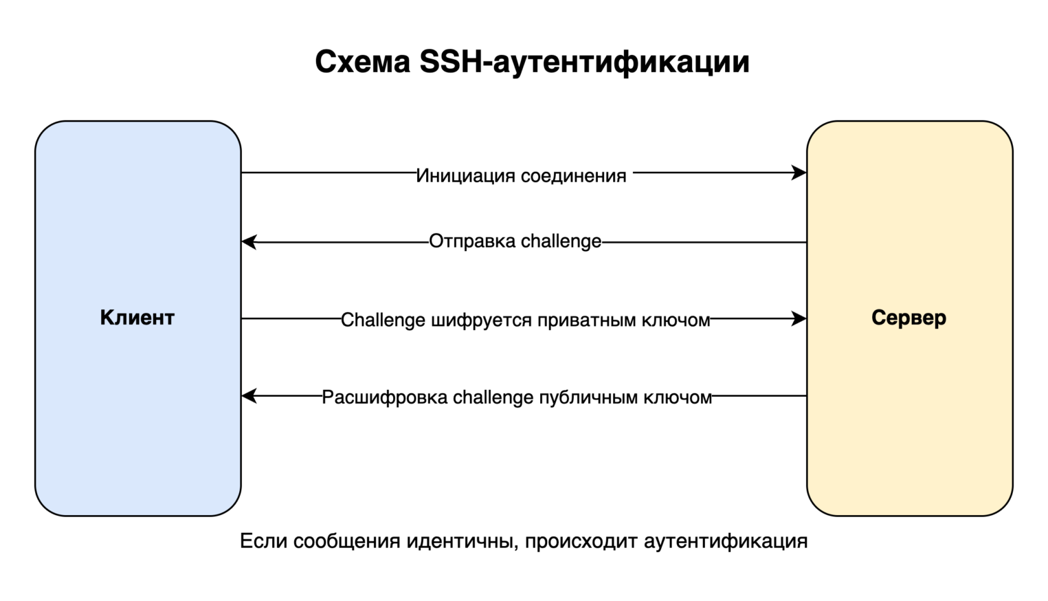 Во время подключения по SSH сервер отправляет клиенту случайную строку (челлендж), которую клиент подписывает своим приватным ключом и отправляет обратно. Сервер, используя публичный ключ, проверяет подпись. Если она корректна, доступ предоставляется, в противном случае — отклоняется. Таким образом, подтверждается владение приватным ключом без передачи каких-либо секретных данных по сети. Пароль при этом не нужен вовсе.