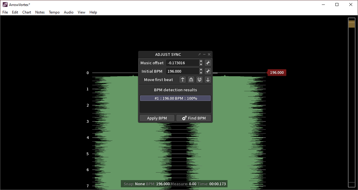 Скачиваем композицию, открываем файл в ArrowVortex. Выбираем Tempo → Adjust Sync… в верхнем меню или сочетанием клавиш Shift + S. В появившемся меню нажимаем Find BPM. Если программа нашла только одно значение BPM, то используем его, нажав кнопку Apply BPM. Если значений несколько, то, вероятно, следует выбрать файл более хорошего качества или вовсе отказаться от этой композиции, по крайней мере для первого раза.