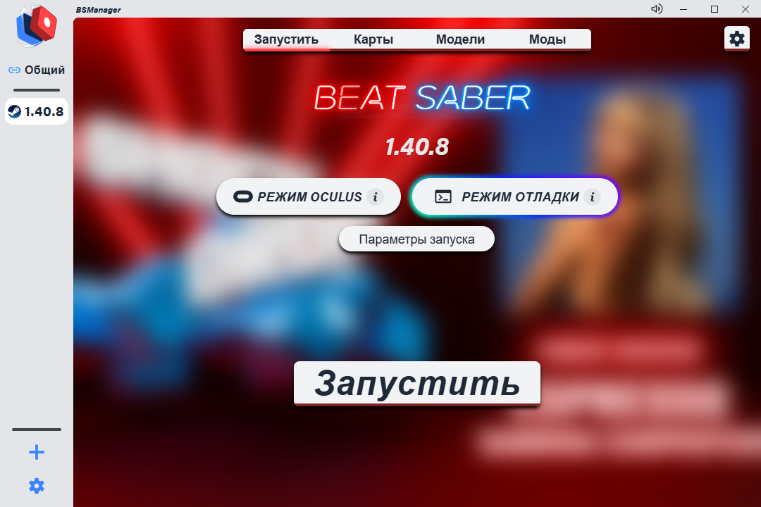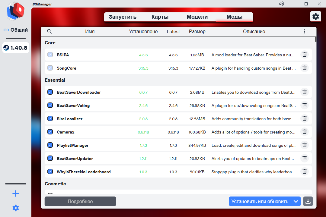 Разработчики в сообществе давно упростили установку и управление модами через BSManager. Этот менеджер модов позволяет в несколько кликов устанавливать разные версии игры, а также управлять пользовательскими картами и косметическими модификациями для мечей, кубиков и сцены в целом.