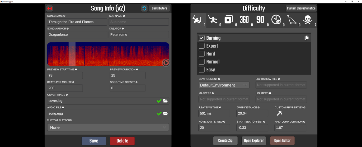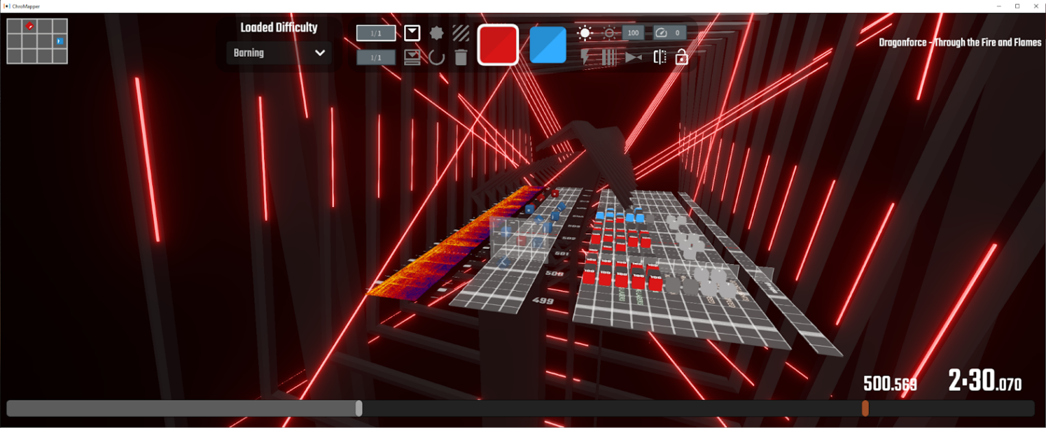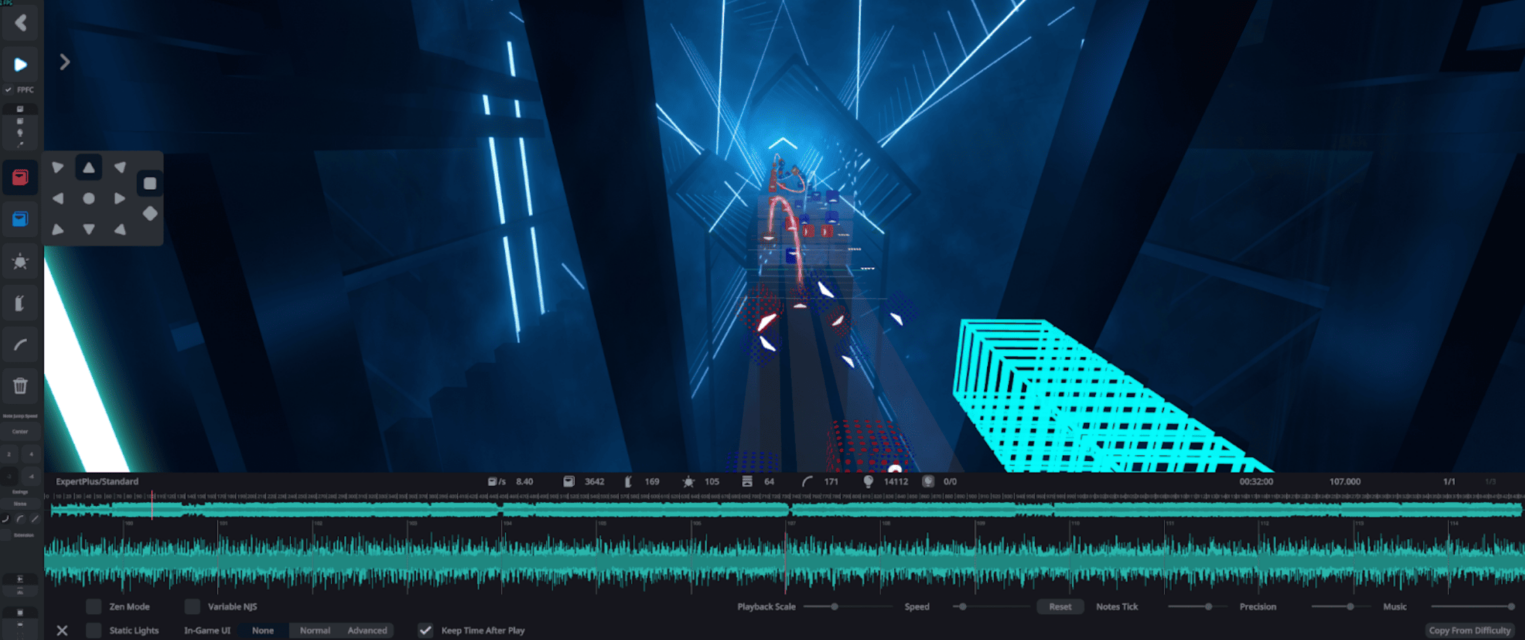 Официальный редактор прост и красив. Если вы прочитали список горячих клавиш ChroMapper, то в официальном редакторе он поддерживается практически один-в-один. Внутриигровой редактор работает на базе игры и поэтому точно показывает состояние блоков и окружения, но он применим только к «чистым» картам без пользовательских модификаций и «тонких настроек».