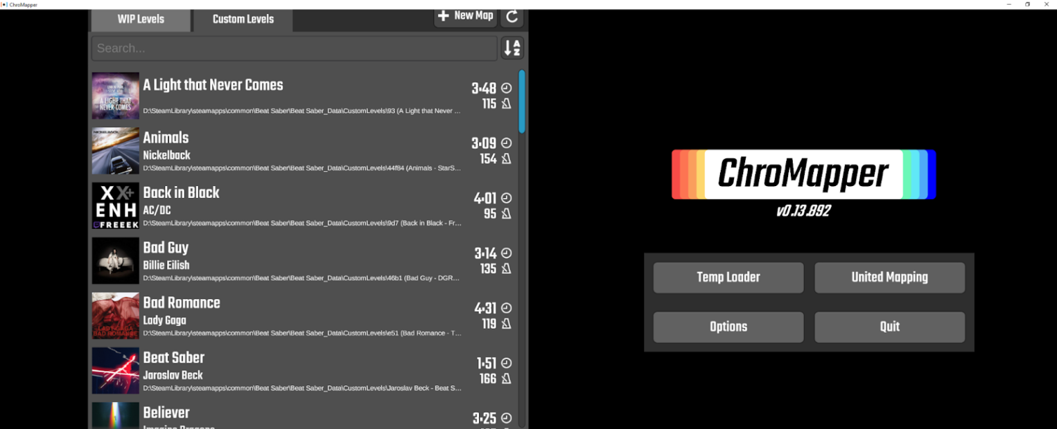 ChroMapper — это самостоятельный редактор, разработанный в сообществе до появления официального редактора. Запускается через лаунчер, который скачивает и устанавливает все необходимые для работы зависимости. При первом запуске необходимо указать каталог с игрой — это необходимо для правильного размещения пользовательских треков.