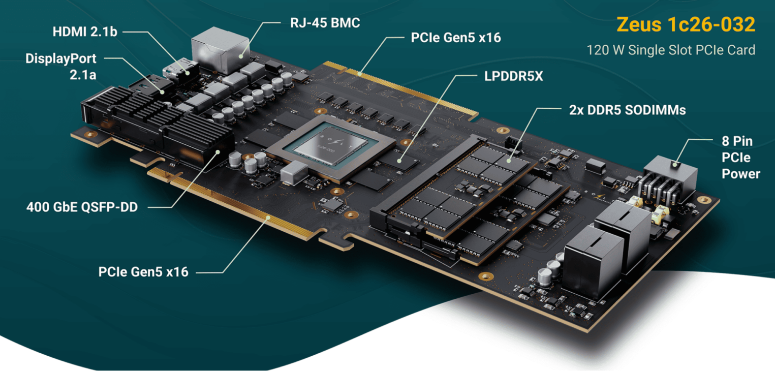 Вместо распространенной в индустрии GDDR-памяти Zeus использует LPDDR5X плюс расширяемые DDR5 SO-DIMM — это дешевле, чем GDDR7 или HBM3e. Но все еще позволяет иметь большой объем до 384 ГБ. Однако пропускная способность памяти оценивается не более 300 ГБ/сек. Тогда как в GDDR7 это показатель в несколько раз выше.
