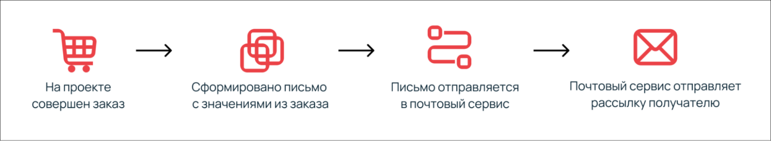 Такая цепочка коммуникаций направлена на повышение LTV (life-time value, пожизненная ценность клиента). Сначала клиент совершает заказ на сайте и получает письмо с подтверждением заказа и чеком — это повышает доверие к компании. Клиент точно знает, что его заказ в работе и его скоро доставят.