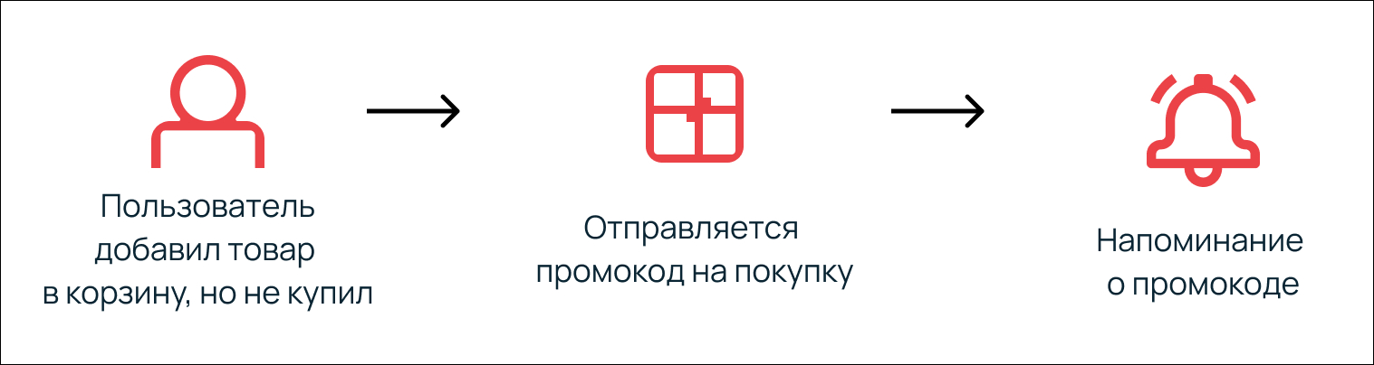 Давайте посмотрим, как работает автоматизированная коммуникация с пользователями после внедрения CRM-маркетинга. Важно понимать, что это только примеры. Вы можете создавать и использовать собственные механики, которые подойдут для решения конкретной задачи.