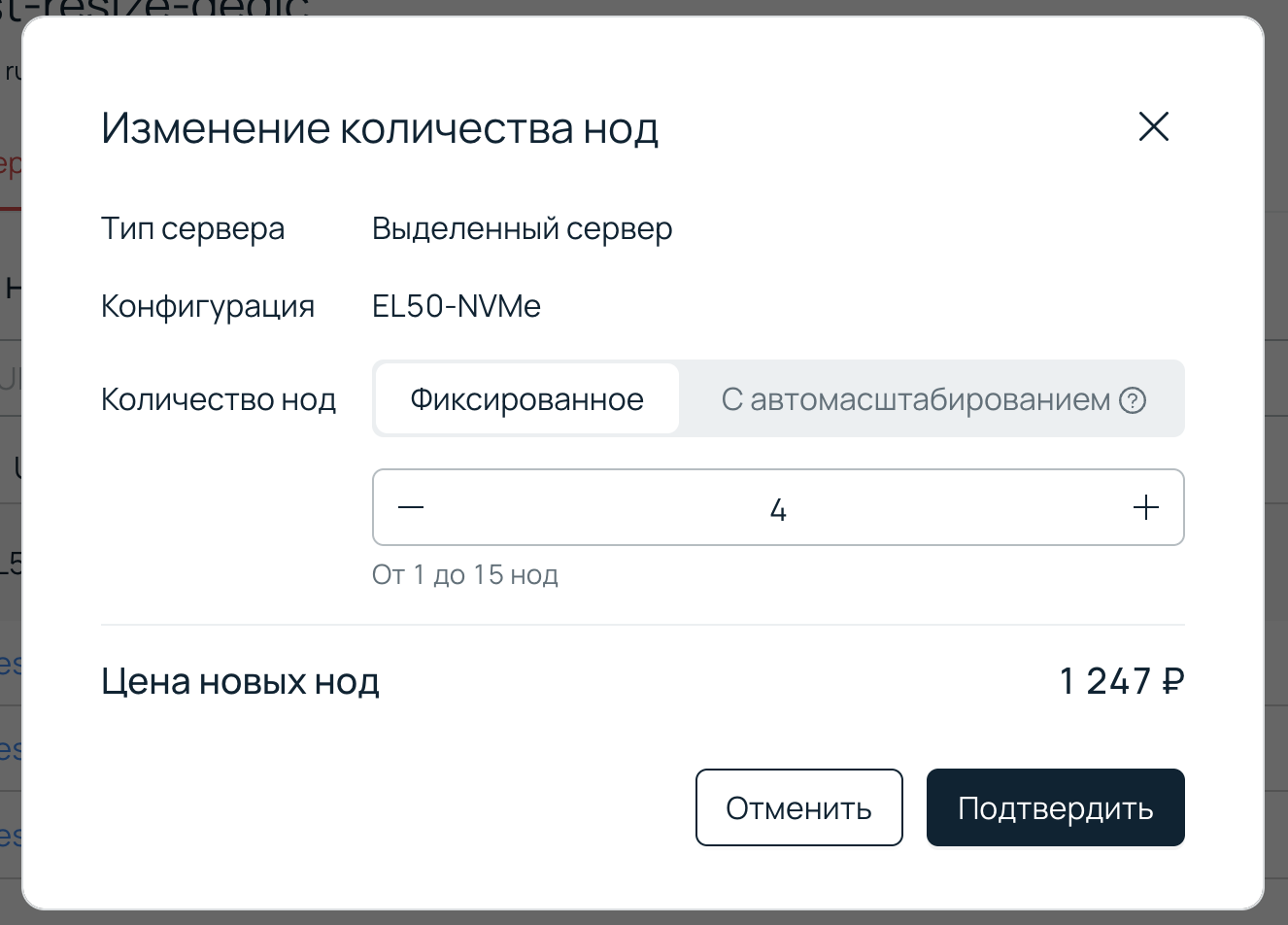 В панели управления теперь можно менять количество нод для выделенных серверов. При увеличении будет отображена стоимость новых нод, при уменьшении — возвращены средства за полные неиспользованные месяцы. Добавить новые ноды можно только при наличии средств на основном балансе. Опция полезна при росте нагрузки на кластер или масштабировании ресурсов.