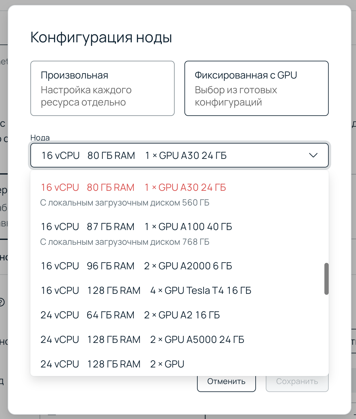 В настройке группы нод можно выбрать фиксированную конфигурацию облачных серверов с GPU и локальными дисками. Это позволяет увеличить производительность и минимизировать задержки приложения.
