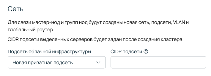 При создании кластера на выделенных серверах теперь можно самостоятельно настроить CIDR облачной подсети. Кластеры Kubernetes основаны на гибридной архитектуре: воркер-ноды работают на выделенных серверах, а мастер-ноды — на облачных. Сетевая связность организована через глобальный роутер Selectel.