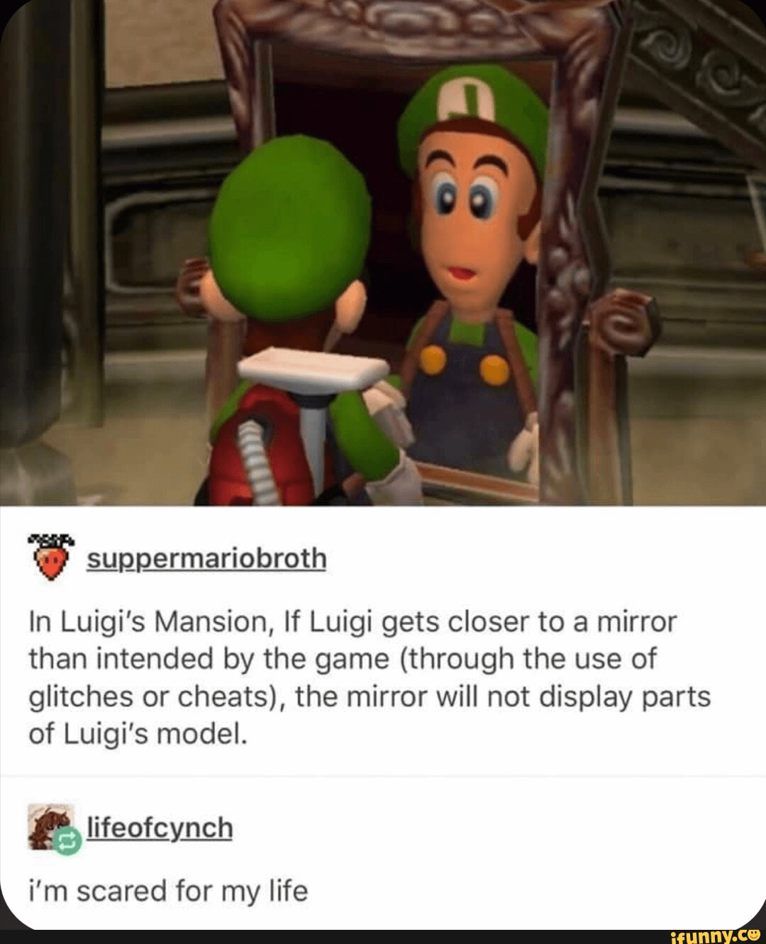 Luigi’s Mansion — игра с легким комедийным подтекстом и мультяшным стилем, в ней нет серьезного ужаса. Но если внимательно посмотреть в зеркало в некоторых комнатах, можно заметить кое-что странное. Отражение Луиджи иногда выглядит искаженным, либо его тело будто бы зависает в воздухе.