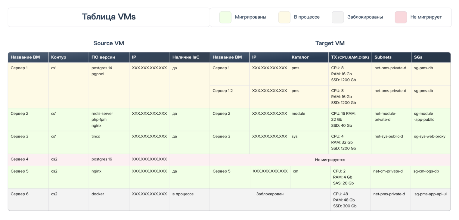 Для удобства можно подготовить матрицу миграций, в которой отражаются виртуальные машины-источники и цели, их количество, группы безопасности и другие важные параметры. Такой подход помогает структурировать процесс и минимизировать риски.