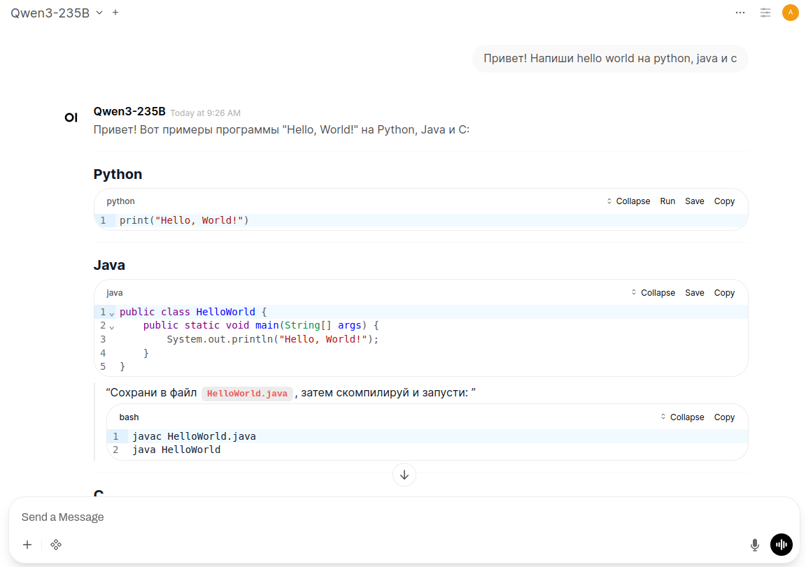 Примечание. Сборка llama.cpp делается на Ubuntu, но бинарные файлы совместимы с SelectOS — дополнительной настройки не требуется. Можно собрать самостоятельно, в этом нет магии, но для простоты я опустил этот момент.