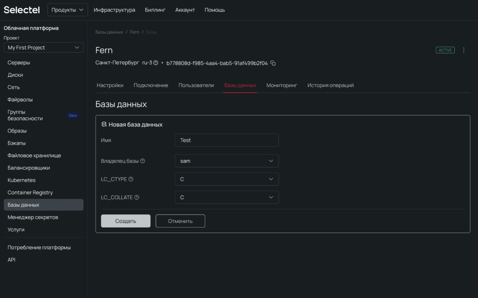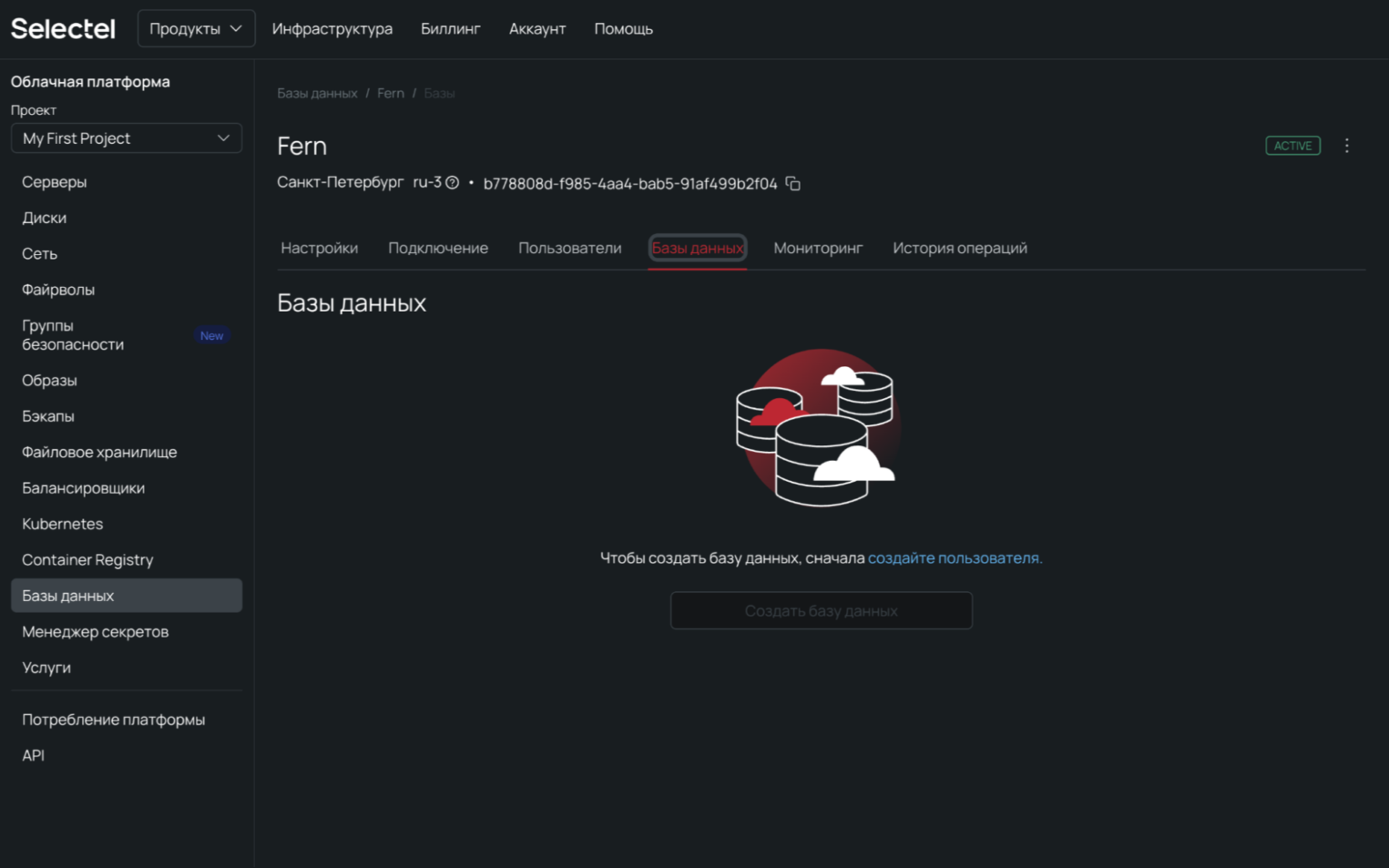1. Теперь внутри кластера вам нужно создать саму базу данных. Для этого во вкладке Базы данных нажмите на кнопку Создать базу данных.