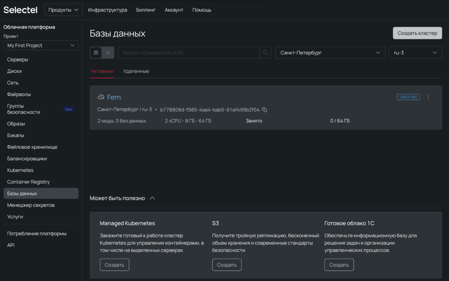 3. Нажмите кнопку Создать кластер. Дождитесь, чтобы статус сменился с CREATING на ACTIVE — и кластер готов.