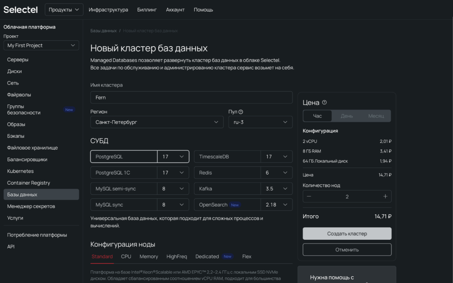 2. Нажмите кнопку Создать кластер и соберите необходимую конфигурацию. В качестве СУБД укажите PostgreSQL.