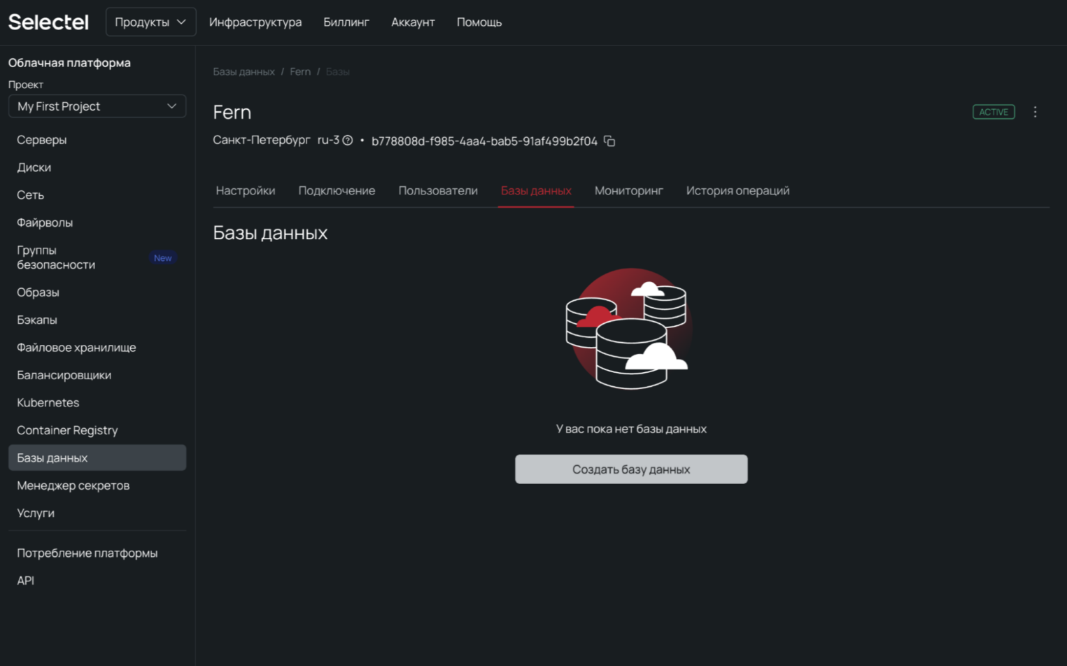 1. Перейдите в список своих кластеров баз данных, в раздел Облачные базы данных. Нас интересует вкладка Активные.