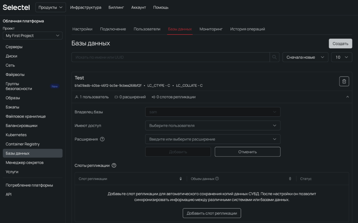 1. Перейдите в панель управления, в раздел Облачные базы данных.