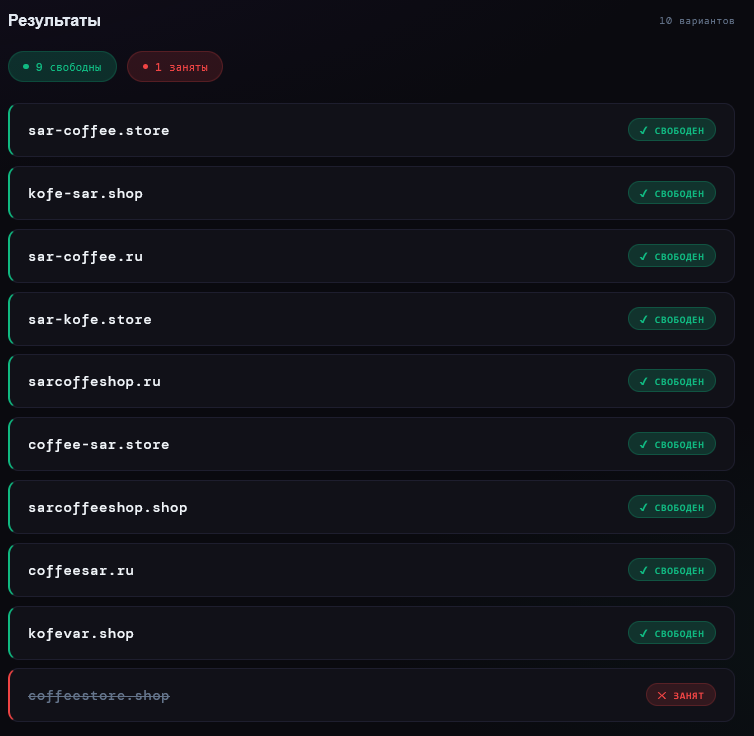 Во втором случае я решил проверить более узкую нишу — «Магазин кофейной продукции в Саратове». В качестве целевых зон выбрал .store, .shop и .ru, ограничив выдачу 10 вариантами.