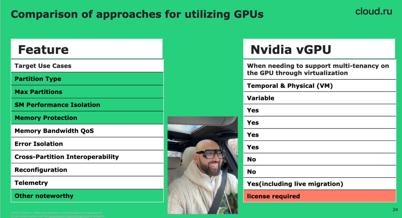 Чтобы решить эти проблемы, коллеги из Cloud.ru разработали собственную технологию управления GPU-ресурсами — vGPU. Подробнее о решении Артемий рассказал в своем докладе.