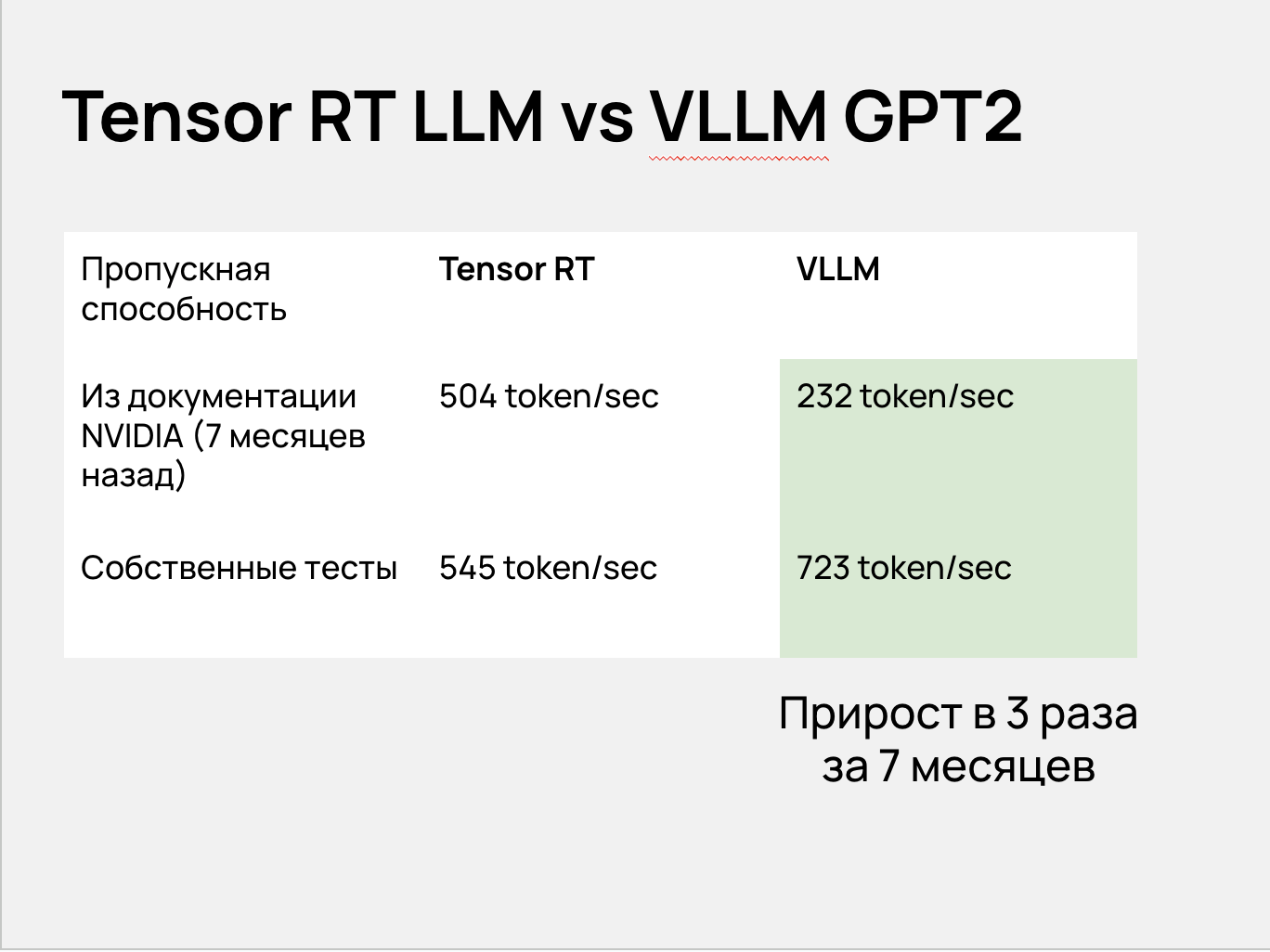 Если важна скорость внедрения и стабильность под реальной нагрузкой, vLLM сейчас — оптимальный выбор. TensorRT остается актуальным, когда в приоритете кастомная оптимизация под конкретное топовое «железо» и максимальная выжимка производительности.