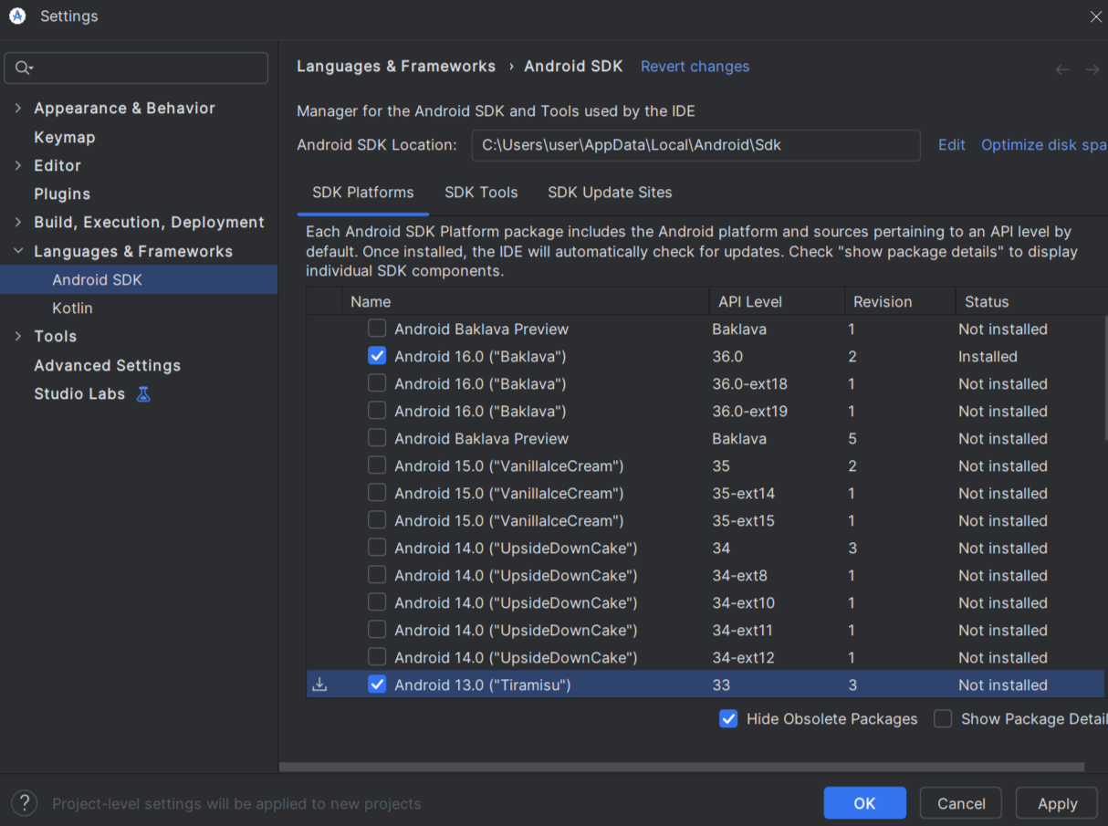 - последнюю доступную SDK (актуальная на момент написания — API Level 36 / Android 16);