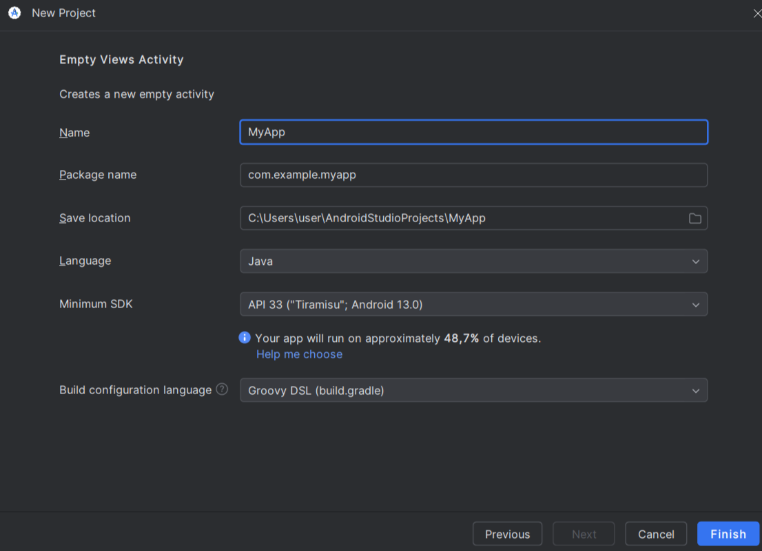 4. Нажмите Finish. Android Studio создаст заготовку проекта — пустой экран (Activity), необходимые Gradle-файлы — и подключит SDK.