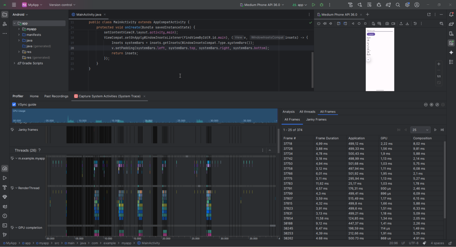 - UI: средняя длительность кадра — 4–6 мс (редко до 11 мс). Это значительно ниже пороговых 16,6 мс (60 fps), значит, интерфейс работает плавно, задержек и «фризов» пользователь не видит.