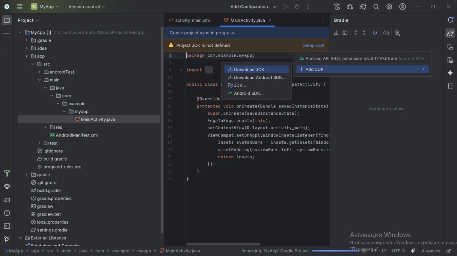 3. Для компиляции кода на Java требуется JDK (Java Development Kit). Android Studio автоматически проверяет его наличие и предложит установить, если JDK не найден. Для этого после создания первого проекта нажмите Setup SDK → Add SDK → Download JDK, затем подтвердите рекомендуемую версию.