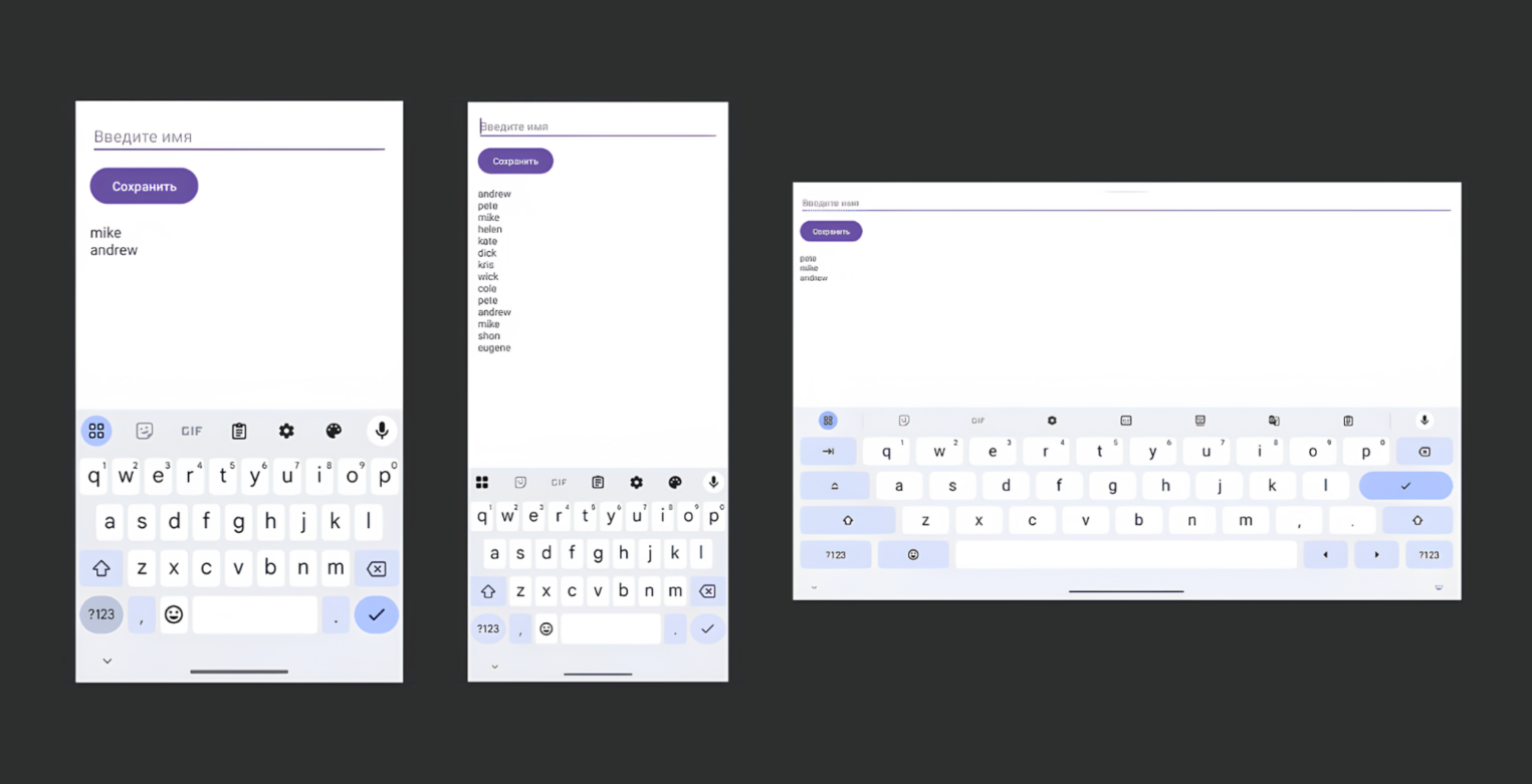 - 3. Сравнили отображение элементов интерфейса: поле ввода, кнопка и список. А кроме того, реакцию на появление клавиатуры.