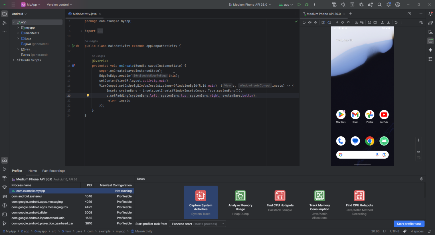 1. Верхнее меню: View → Tool Windows → Profiler. Выбирали запущенное виртуальное устройство и процесс приложения com.example.myapp.