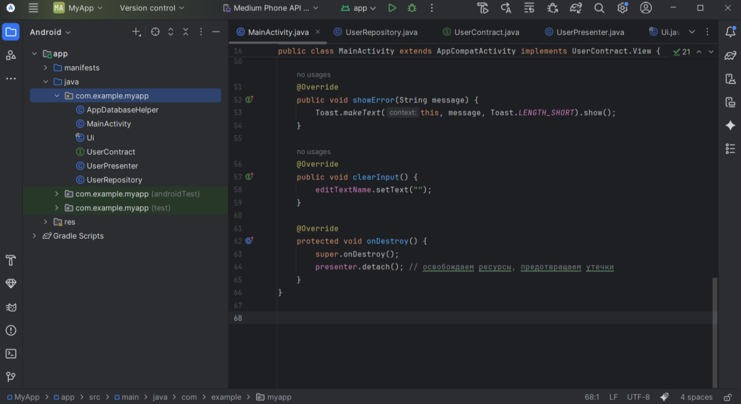 - MainActivity — это View (представление). Отвечает только за отображение интерфейса, передачу действий пользователя в Presenter, показ результата (списка пользователей, ошибок).