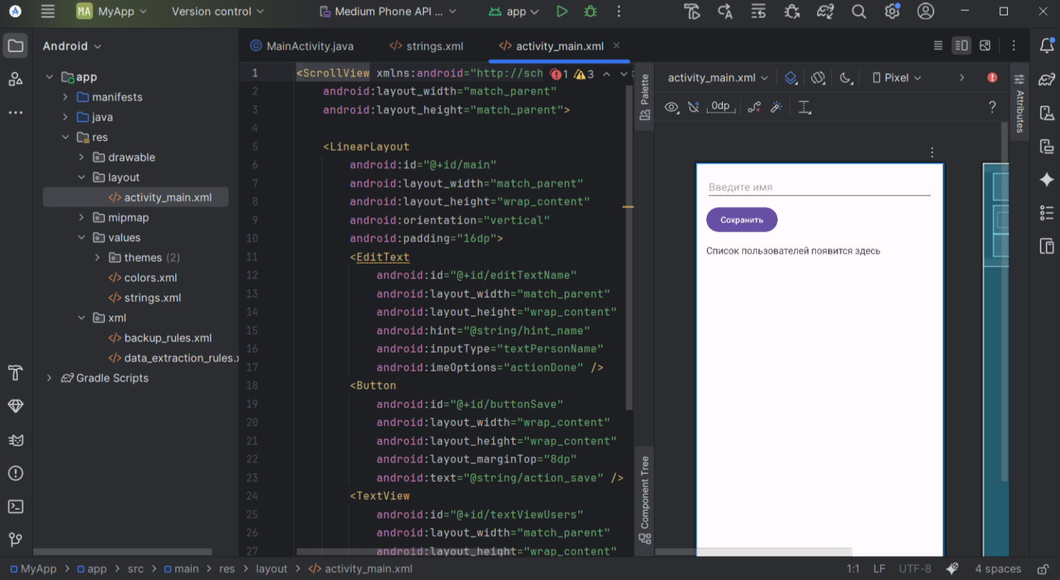 Мы использовали связку ScrollView + LinearLayout, чтобы интерфейс можно было прокручивать, если элементов на экране будет много. В реальных проектах часто используют ConstraintLayout, но для учебного примера достаточно LinearLayout.