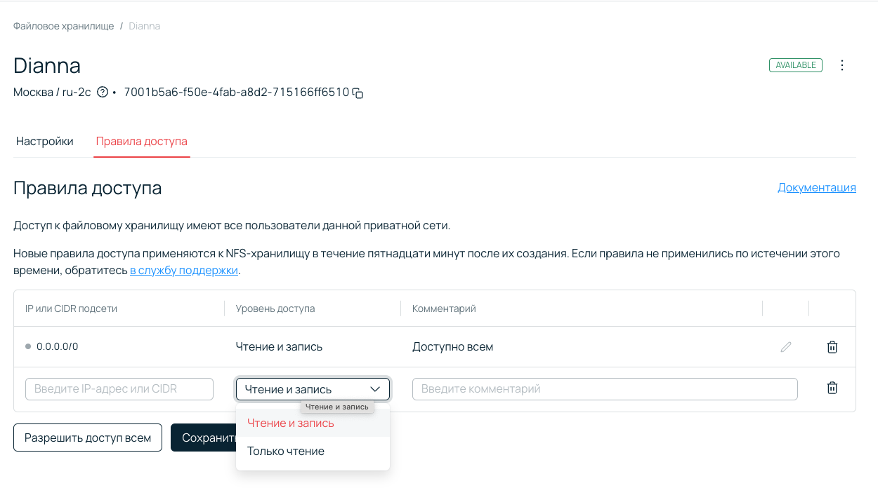 Selectel ограничил доступ к хранилищу с портов, не относящихся к работе протоколов NFSv4 и CIFS SMBv3, чтобы максимально обезопасить данные клиентов от внешнего злонамеренного воздействия. Также предусмотрена ручная настройка разрешений для доступа с определенных IP-адресов как в локальной, так и во внешней сети. Ниже — скриншот с правилами.