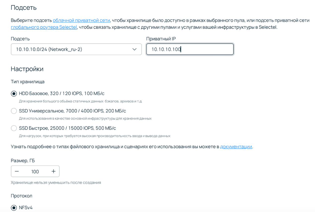 На скриншоте — выбрано название, объем хранилища, сеть. IP‑адрес получаем автоматически из свободных или задаем вручную. Протокол — NFSv4.