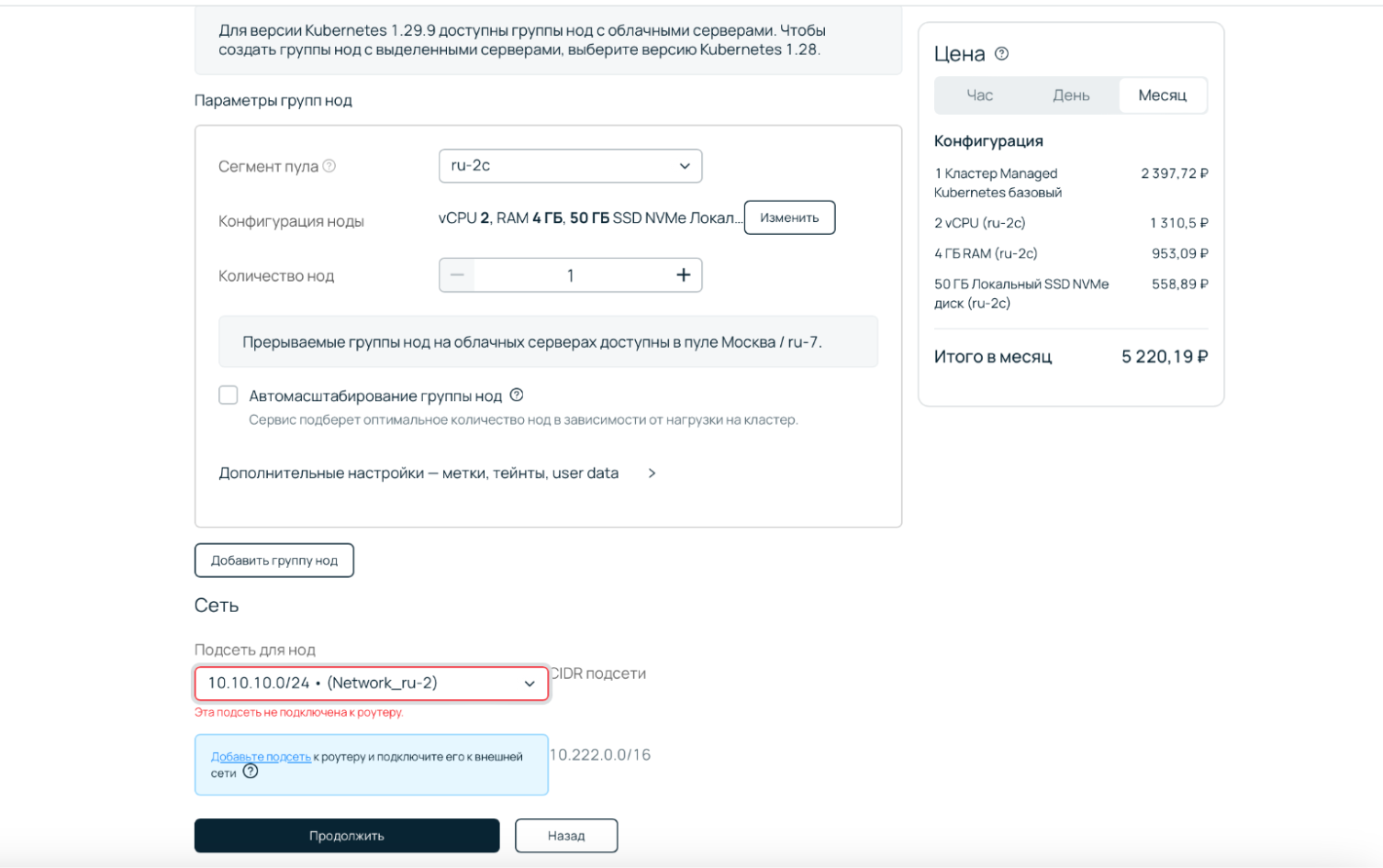 Важный момент: для доступа услуги к другим сервисам кластеру требуется прописать маршруты из-за использования облачного роутера. В отличие от файлового хранилища, где шлюз по умолчанию направлен на глобальный роутер, для кластера K8s шлюз по умолчанию должен быть направлен на облачный роутер — так обеспечивается доступ во внешнюю сеть, что обусловлено архитектурой услуги.