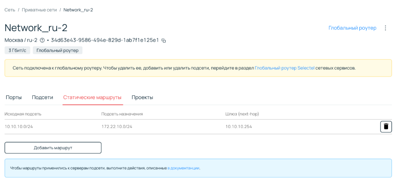 Задача состояла в том, чтобы добавить маршрут к сети, предоставляющий доступ только выделенному серверу. Для этого мы изменили шлюз по умолчанию с глобального роутера на облачный, открыв кластеру доступ к внешней сети. Чтобы обеспечить доступ к локальной сети, мы добавили только один маршрут к одной сети. Облачная платформа в ru-9 не была включена в этот список. Это может быть полезно, если требуется ограничить или разрешить доступ к определенным сегментам.