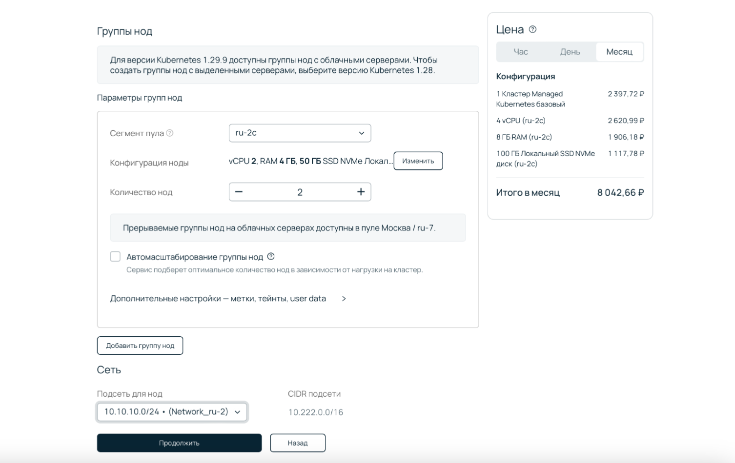 В панели управления, при заказе услуги Managed Kubernetes, видим такое понятие, как «Группа нод» — это набор идентичных серверов, они будут одинаковые в каждой группе, хотя сами они обычно отличаются.