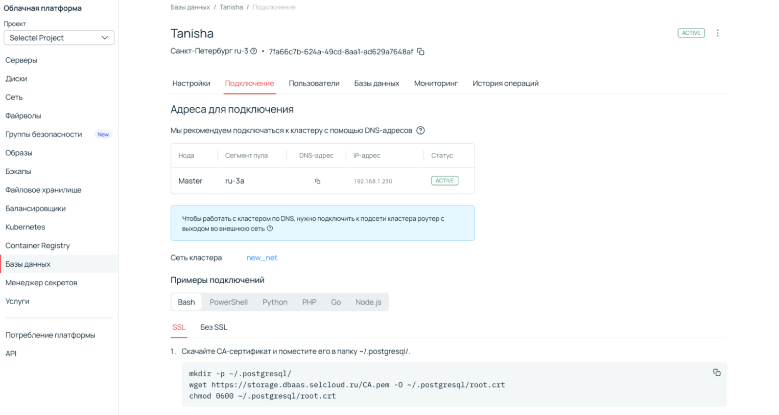 1. Разверните кластер в панели управления. Как это сделать, подробно описано в документации.