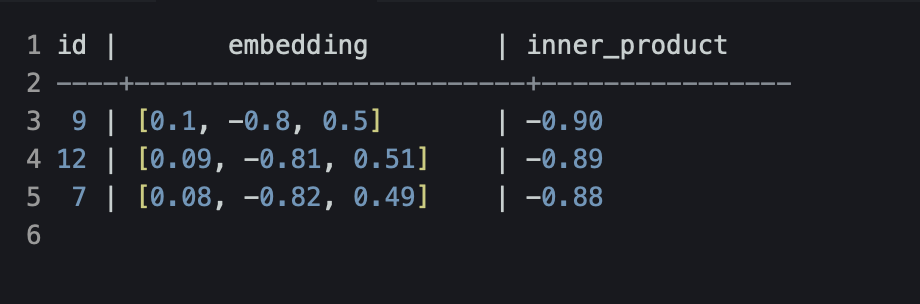 SELECT id, embedding, embedding <-> '[0.1, -0.8, 0.5]' AS inner_product