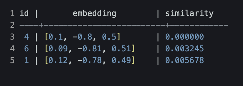 SELECT id, embedding, embedding <-> '[0.1, -0.8, 0.5]' AS similarity