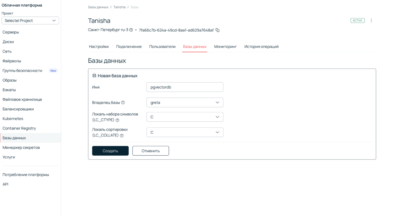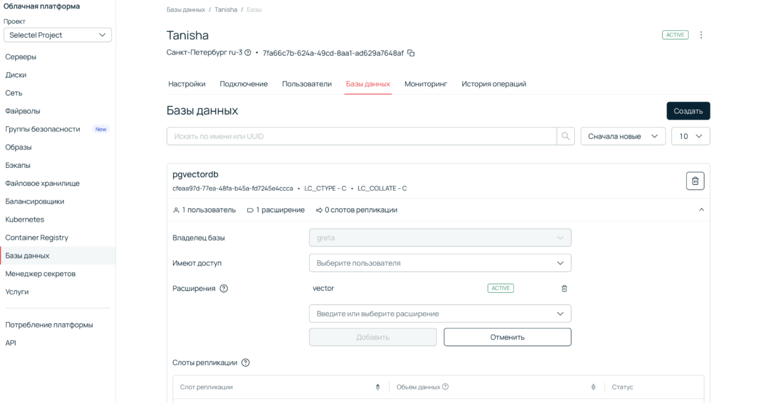 В облачном PostgreSQL от Selectel pgvector можно установить в пару кликов через панель управления. С полным списком поддерживаемых расширений можно ознакомиться в документации.