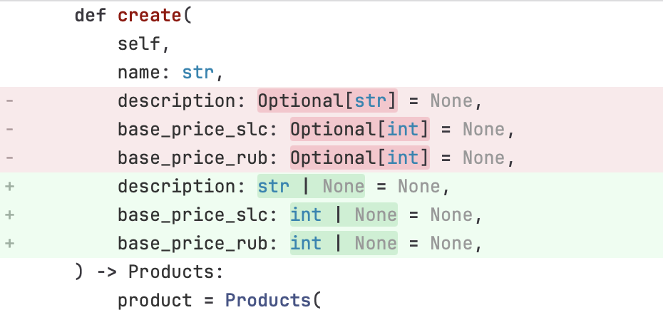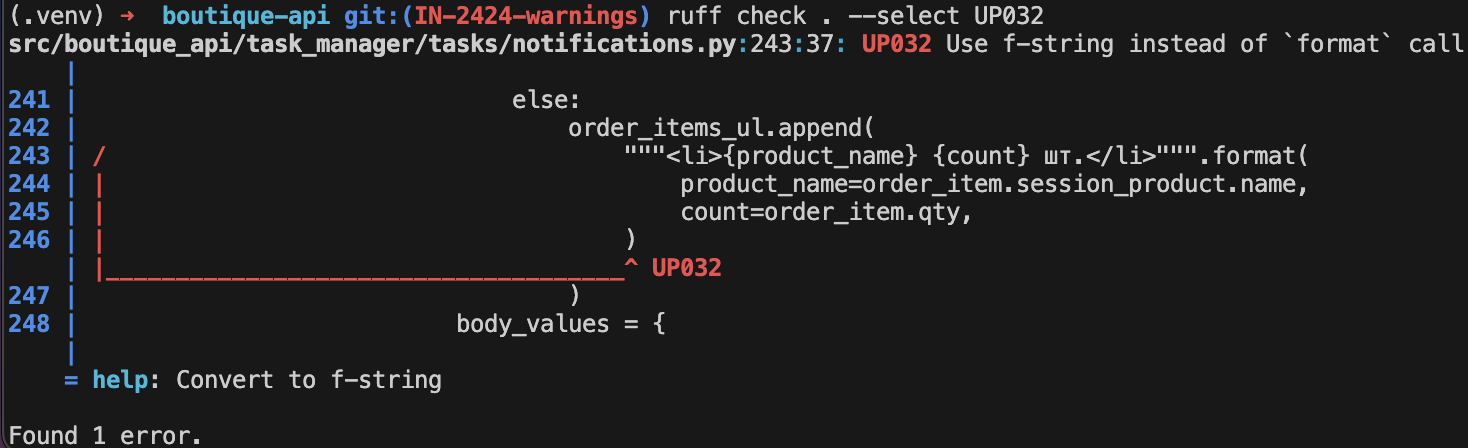 Давайте я покажу несколько примеров того, что конкретно и как изменилось. Ниже на скрине один из сотни фиксов, которые Ruff предложил исправить. Если в новой версии Python улучшили синтаксис или типизацию, вы получаете рекомендацию по доработке кода:
