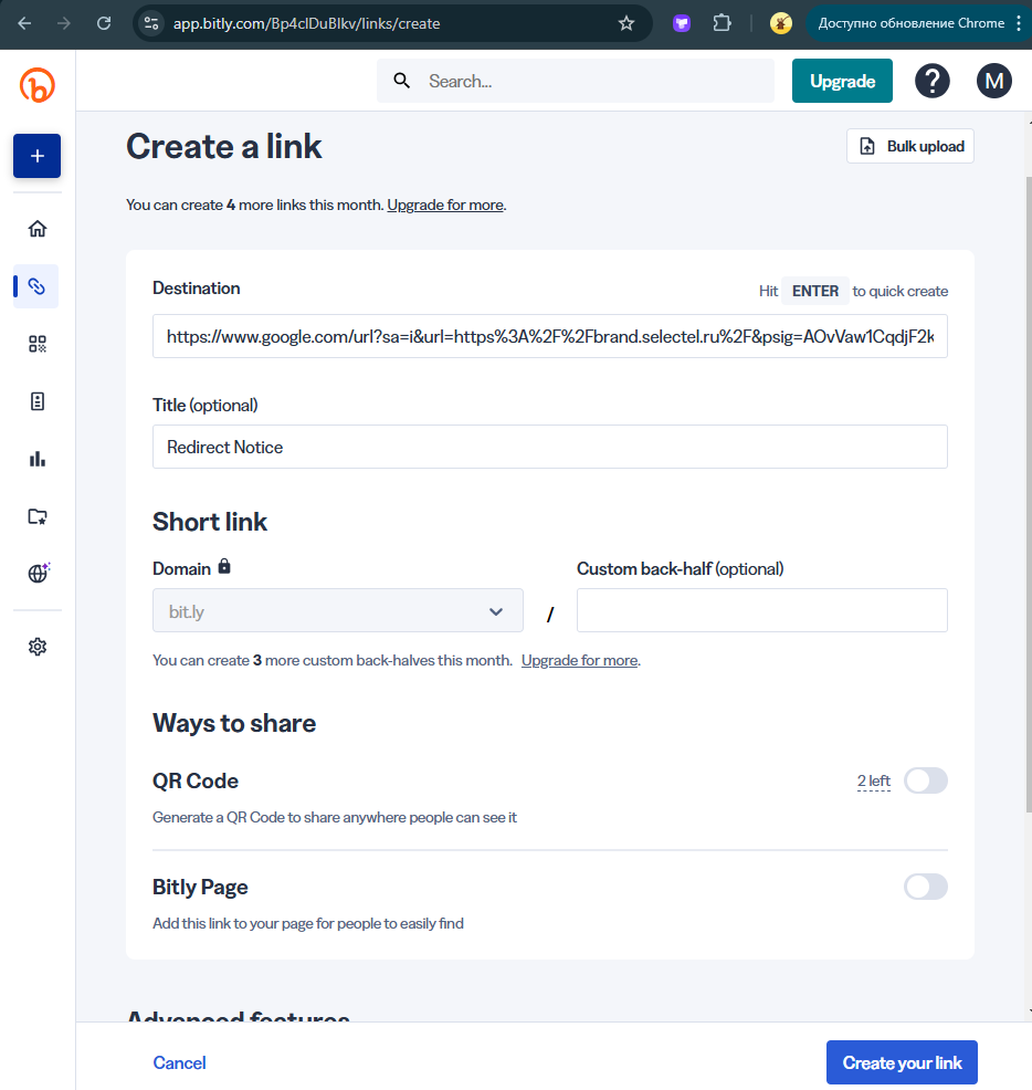 Однако есть нюанс: доступ к продвинутым возможностям вроде генерации QR-кодов и расширенной статистики открывается только на платных тарифах. Минимальный — Core за $10 в месяц, для более активной работы подойдут Growth ($29+) и Premium ($199+). Бесплатная версия с лимитом в пять сокращений в месяц скорее ознакомительная — для полноценных задач ее не хватит.