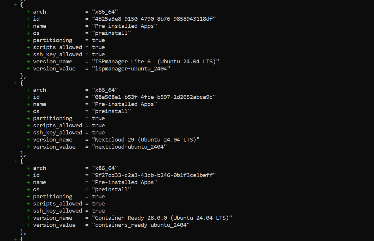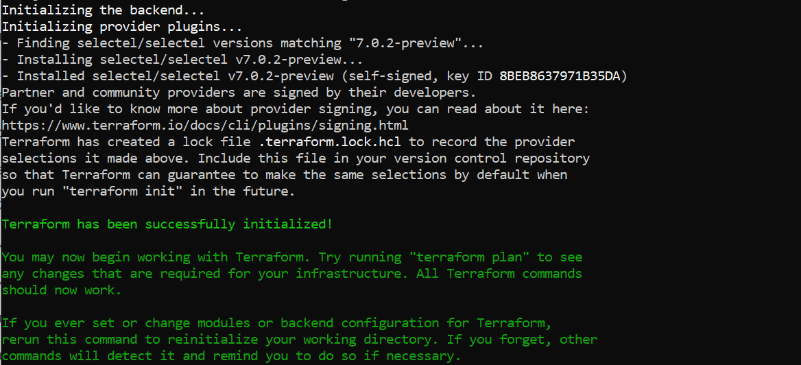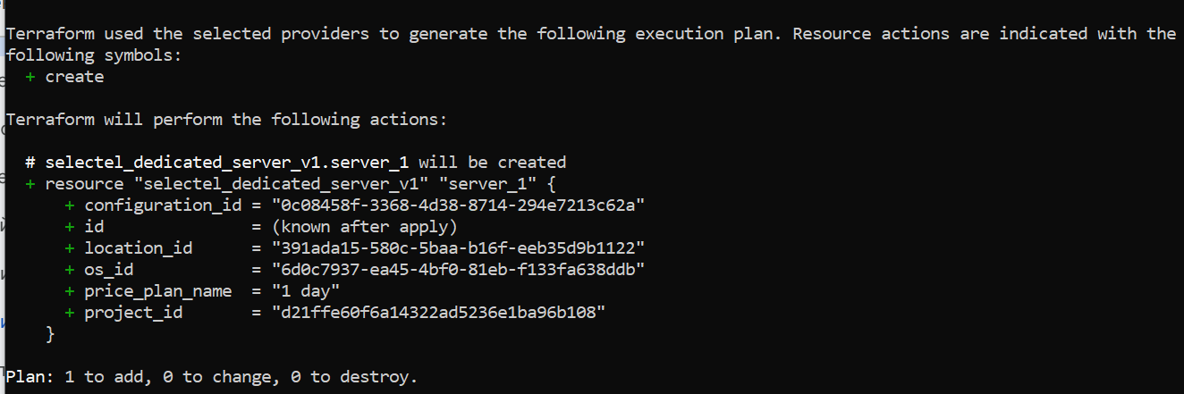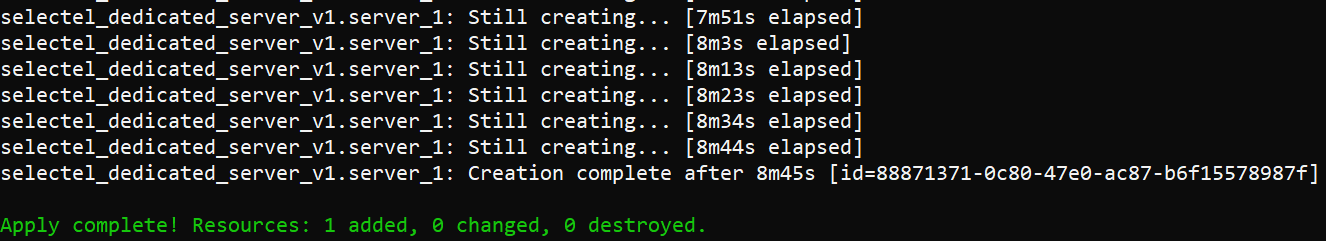 Отлично — можно выполнить терраформ apply. Установка сервера может занимать от 5 до 30 минут в зависимости от выбранного образа, размера и разбивки дисков.