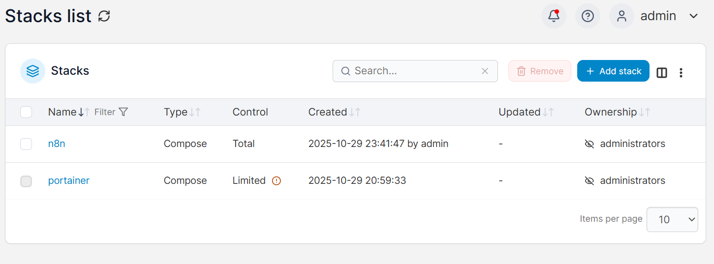 На открывшейся странице видим список всех запущенных «стаков». Stacks — это запущенные Docker Compose, в которых может быть как один контейнер (как в нашем примере ранее), так и сразу несколько. Например, сайт + БД + Redis и так далее.