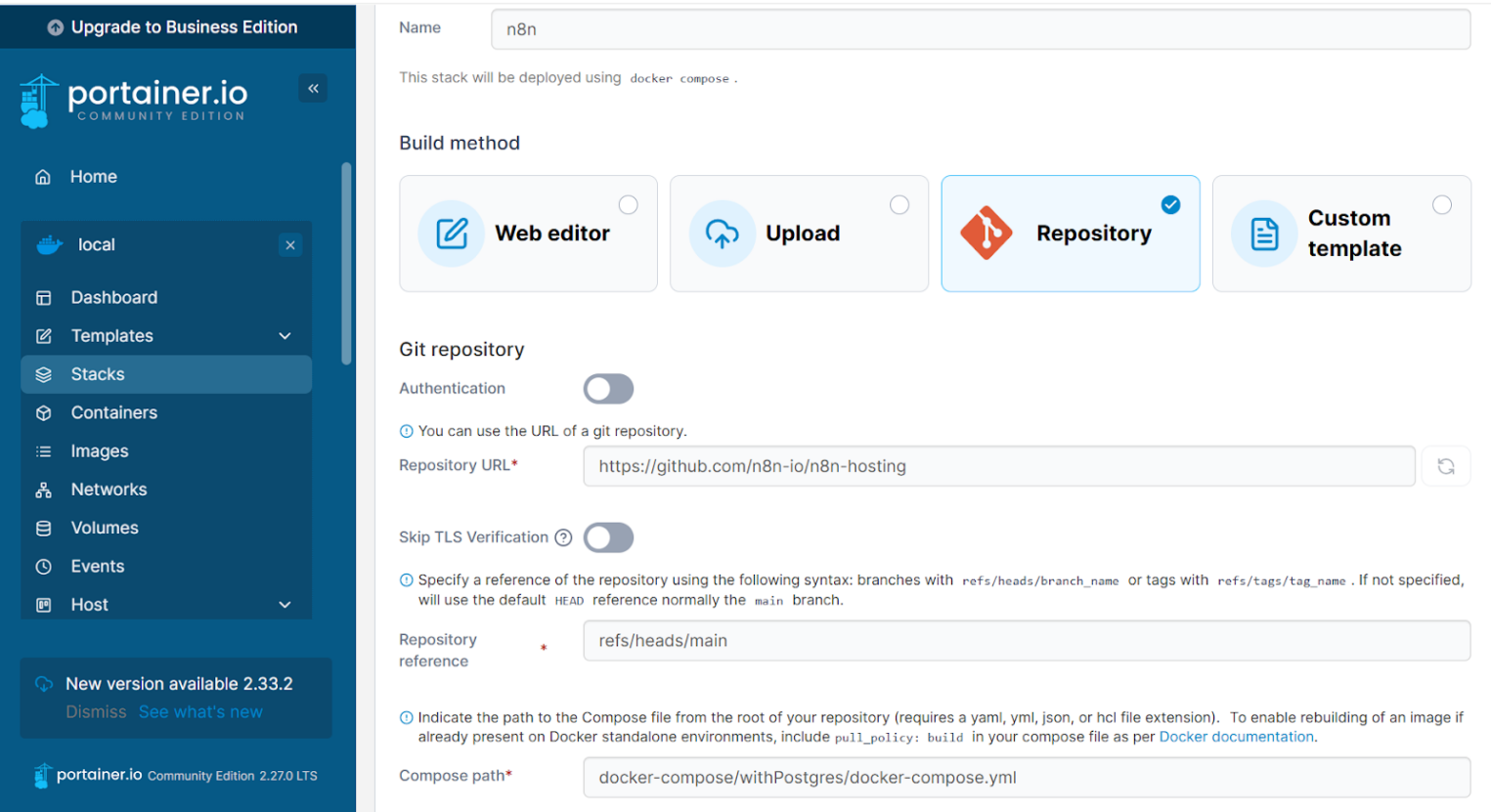 Portainer позволяет запускать контейнеры из файлов compose, созданных в веб-редакторе панели, загруженных с локального устройства, и размещенных в git-репозитории. Воспользуемся последним вариантом, так как для него можно настроить автоматический перезапуск контейнеров в случае обновления.