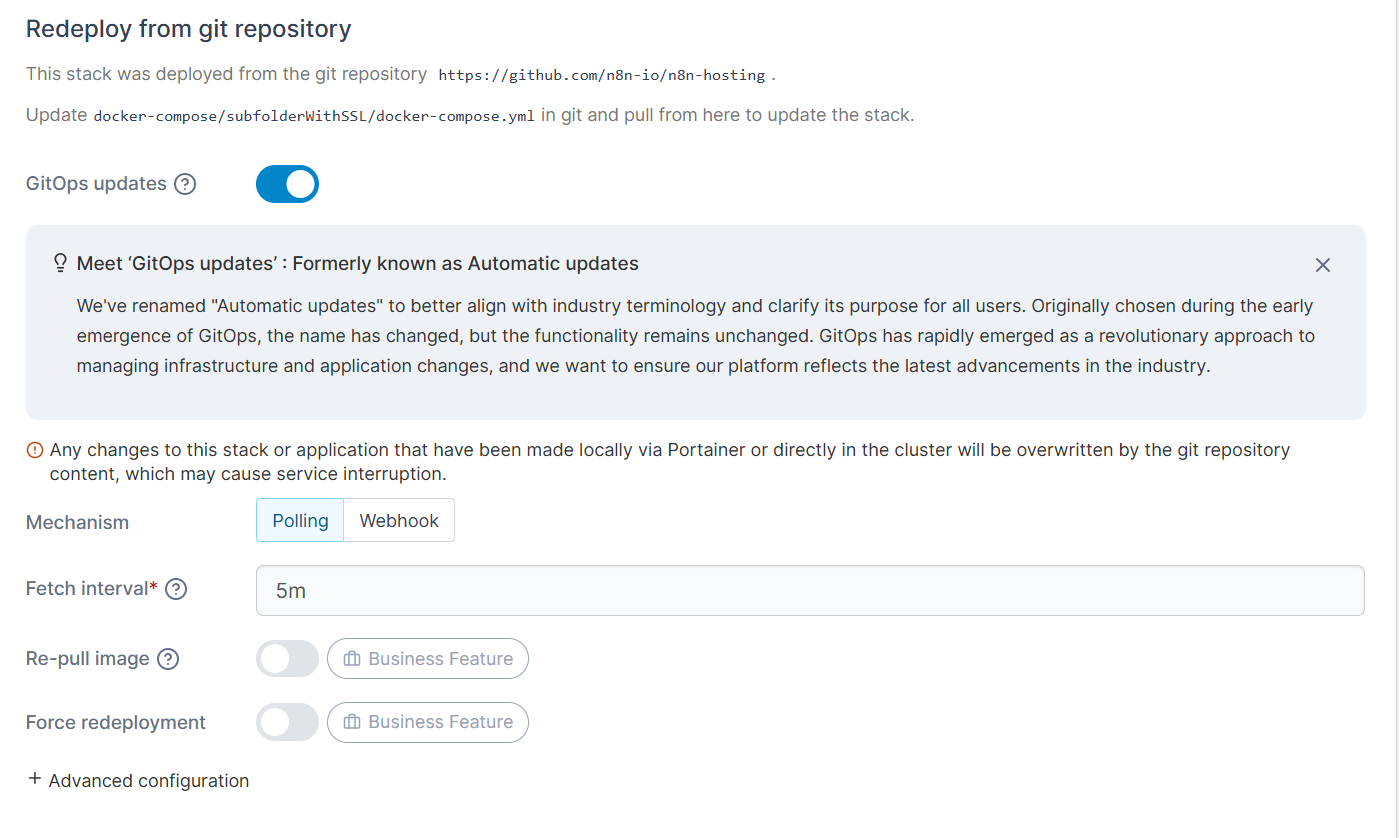 - Mechanism – способ проверки изменений: Polling – Portainer будет самостоятельно проверять изменения исходя из установленной частоты проверки; Webhook – инициализация проверки изменений при отправке запроса на указанный URL. Удобно для CI/CD.